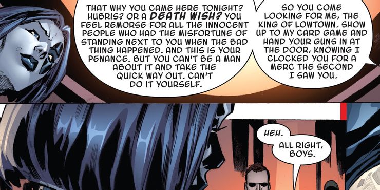 Durante el transcurso del juego, uno de los jugadores, familiarizado con los poderes de Domino, comenta sobre la tendencia a morir de personas inocentes cerca de ella, especulando que Domino está jugando el juego por remordimiento, y tiene razón. También señala que la culpa de Domino la lleva a situaciones de alto riesgo. Sus poderes la han convertido en una de las mercenarias más formidables del mundo, pero la desventaja oscura e inquietante que conllevan ha ejercido presión sobre Domino, forzándola a situaciones en las que se verá obligada a usar más sus poderes y potencialmente causar más. inocentes a morir. Es un detalle que convierte a Domino en un personaje mucho más complejo: alguien con uno de los poderes más envidiables de los cómics y, sin embargo, también un héroe que sabe que cada vez que pelea la buena batalla, pueden morir inocentes.