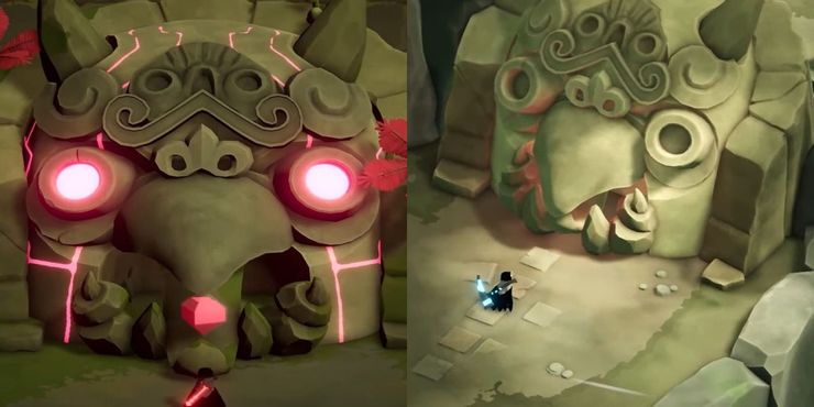 el juego isometrico Puerta de la muerte puede ser un juego desafiante al principio debido a la pequeña cantidad de HP que tiene el cuervo y las pocas veces que puede usar sus habilidades. Con suerte, los jugadores pueden encontrar santuarios que aumentan la vitalidad y las estadísticas mágicas. Estos santuarios en forma de cuervo contienen un cristal de vitalidad o un cristal mágico, y hay 8 de ambos. Los santuarios emiten un brillo de color que indica qué cristal hay dentro, verde para la vitalidad y rosa para la magia.