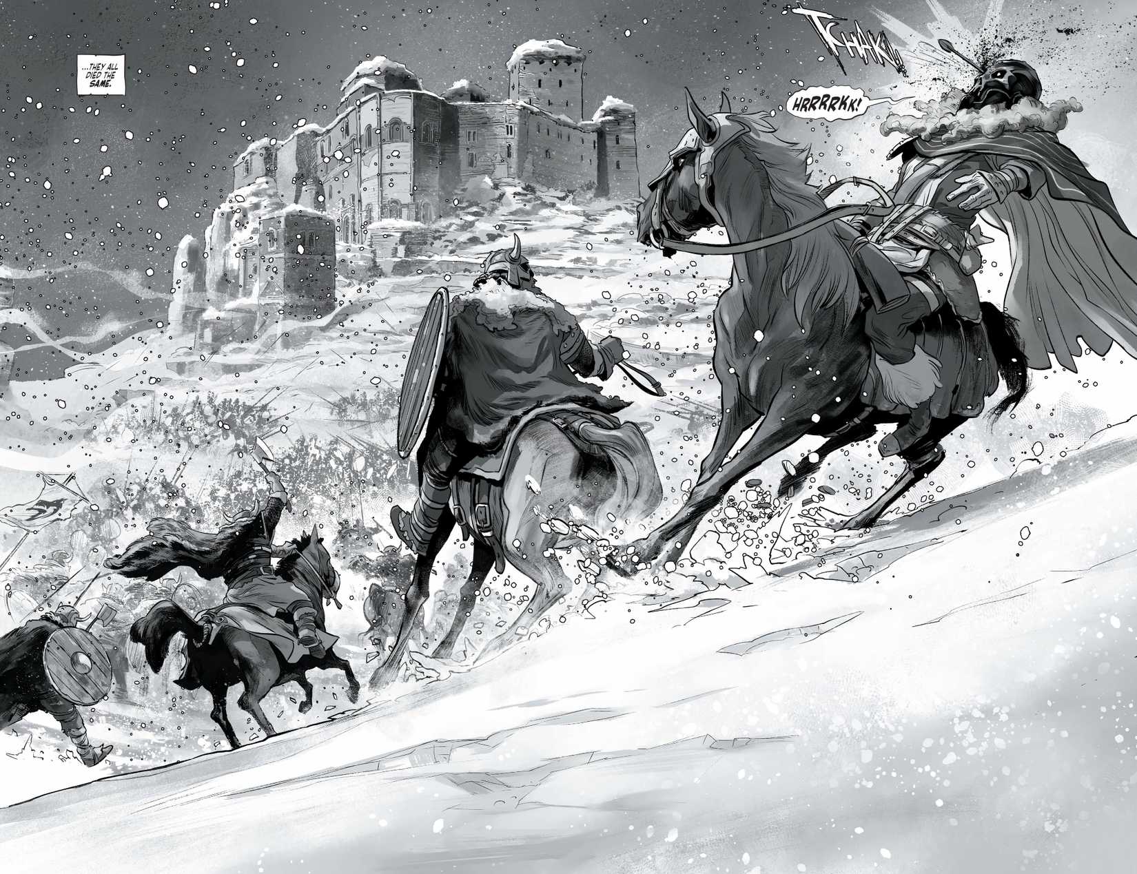 Caballeros oscuros de acero: Allwinter El número 1 sumerge inmediatamente a los fanáticos en una sorprendente escena en blanco y negro de un sangriento campo de batalla etiquetado “La batalla de Svartfjell, 21 d. C.”, ambientada seis meses después de los acontecimientos de Taylor. Caballeros oscuros de acero Serie. La batalla se desarrolla entre una banda de guerra liderada por Deathstroke y el ejército de Jarl Máscara Negra, con Slade luchando a sueldo en nombre de Jarl Vandar. Si bien el motivo del conflicto no se indica explícitamente, el resultado es inequívoco. Deathstroke logra la victoria al enviar una flecha de ballesta al ojo de Máscara Negramatando al Jarl y provocando que sus hombres rompieran filas y huyeran.