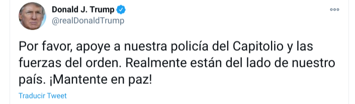 Trump también pidió a sus simpatizantes que apoyen a las fuerzas del orden que resguardan el recinto gubernamental.