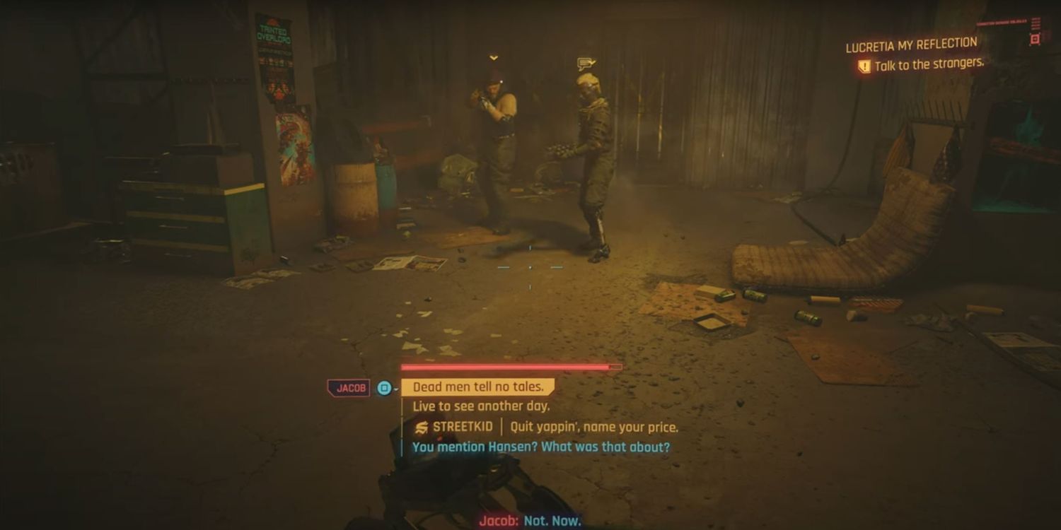 [Warning: The following article contains mild spoilers for Cyberpunk 2077: Phantom Liberty.]Poco después de comenzar el nuevo contenido para Libertad fantasmahay una misión principal titulada “Lucrecia mi reflejo,”, que es interrumpido por dos lugareños de Dogtown que, sin saberlo, se topan con un lugar en el que no deberían estar. V y el presidente Myers están escondidos y disfrutan pacíficamente de una bebida mientras escuchan no tan pacíficamente una transmisión de radio cuando ocurre la situación. Aunque Matar NPC en los videojuegos no suele requerir mucho debate moral profundo; cuando existe la posibilidad de salvar a alguien y hacer un amigo, puede que no sea una mala idea.