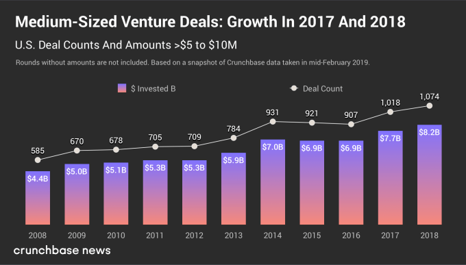 Para las rondas medias, Serie A y B (que solía ser el primer dinero institucional), el mercado de rondas de $ 5 millones a $ 10 millones casi se ha duplicado, pero ha tomado desde 2008 hasta 2018. En ese mismo período, el crecimiento ha aumentado. sido más lento que la ronda por debajo de $ 5 millones. El crecimiento ha continuado a partir de 2015. Desde 2015, las rondas han bajado ligeramente durante un año y luego continúan creciendo en 2017 y 2018. Los recuentos han aumentado desde 2015 en un 17 por ciento y los dólares en un 18 por ciento.