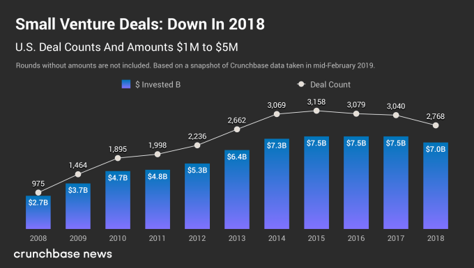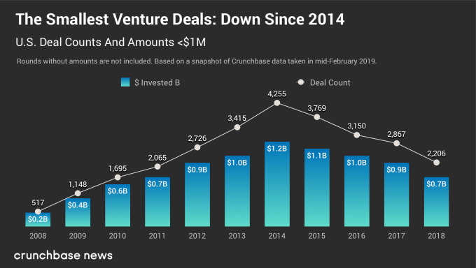 Desde 2014, hemos visto en su mayoría disminuciones de dos dígitos en menos de $ 1 millón de rondas cada año, un fuerte giro desde 2008-2014 cuando vimos un crecimiento de dos dígitos.