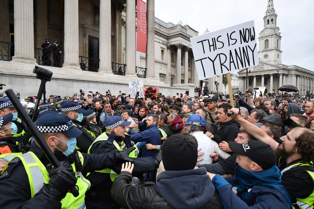 Negacionistas de la pandemia se han enfrentado este sábado con la policía durante una manifestación convocada en Trafalgar Square (Londres) por la organización Stop New Normal (Stop a la Nueva Normalidad). Varios miles de personas han acudido a esta segunda protesta, aún más numerosa que la que tuvo lugar en agosto. Al menos 16 manifestantes han acabado detenidos, y nueve agentes han sufrido heridas. Aunque las protestas forman parte de la excepción contemplada en la llamada “regla de seis”, que prohíbe reuniones de más de seis personas en interiores o exteriores, las autoridades habían advertido a los asistentes de que el acto sería disuelto si no se respetaban las reglas de distanciamiento social. Los carteles improvisados que portaban muchos de los congregados presentaban consignas como “No a la policía Gestapo”, “¿Quién ha visto una pandemia?” o “acabad con las mentiras”.