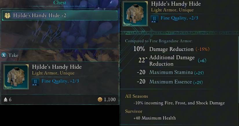 La recompensa por el mapa del tesoro de bolsillos prácticos es una armadura ligera de buena calidad llamada La práctica piel de Hjildeuna excelente opción de armadura de luz para una gama de situaciones diferentes debido a sus diversas resistencias elementales. Esta armadura Comienza como un artículo de calidad fina +2, Por lo tanto, es mejor aferrarse a él en lugar de venderlo o romperlo para la elaboración de materiales, especialmente si juega como guardabosques. Las estadísticas base de Hjilde Hide Hide incluyen una reducción del 10% de daño y una reducción adicional de 22 daños, así como -20 máximo de resistencia y esencia máxima.