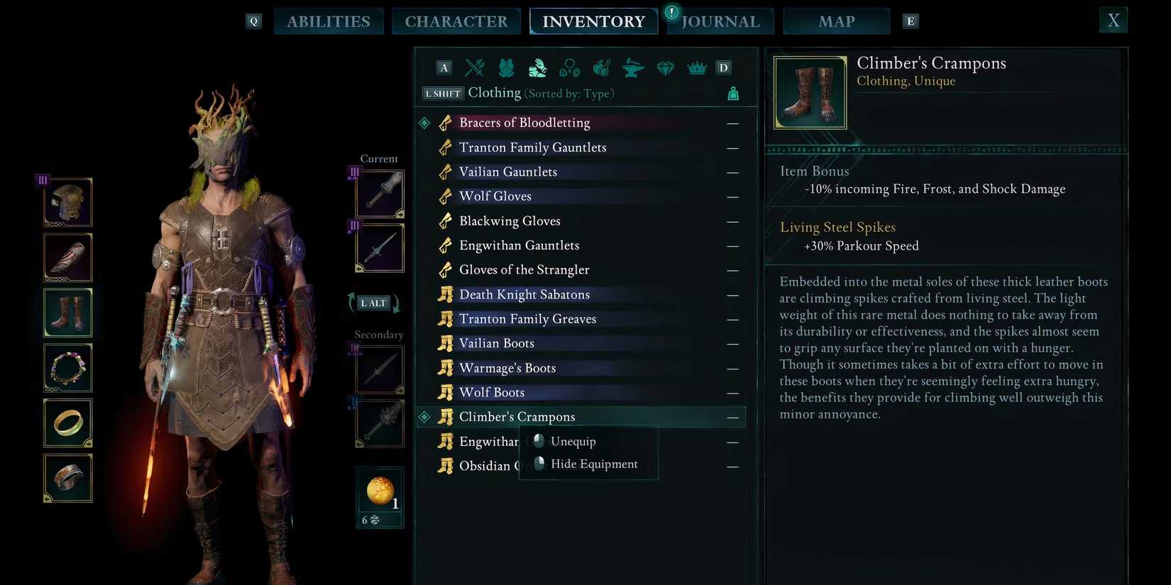Los artículos de parkour que absolutamente necesitas ranurados son los Precaución de Delver anillo (+15% de velocidad parkour), el Crampones de escalador (+30% de velocidad parkour), y el Guantes del arcanista, Brazaletes de sangreo Guantes de Spellbladecada uno aumenta la velocidad de Parkour. Qué guantes que elijas debe sinergizar con tus elecciones de armas, y hay un buen argumento para una construcción basada en el veneno con los guantes de Spellblade en las etapas del juego final. El Kit de envenenador y Banda venicativa son grandes alternativas que pueden apoyarse en una construcción de cuerpo a cuerpo venenoso para complementar sus habilidades de Parkour. De lo contrario, el Anillo de duelo de Vailian y Compañero de cartógrafo son ideales.