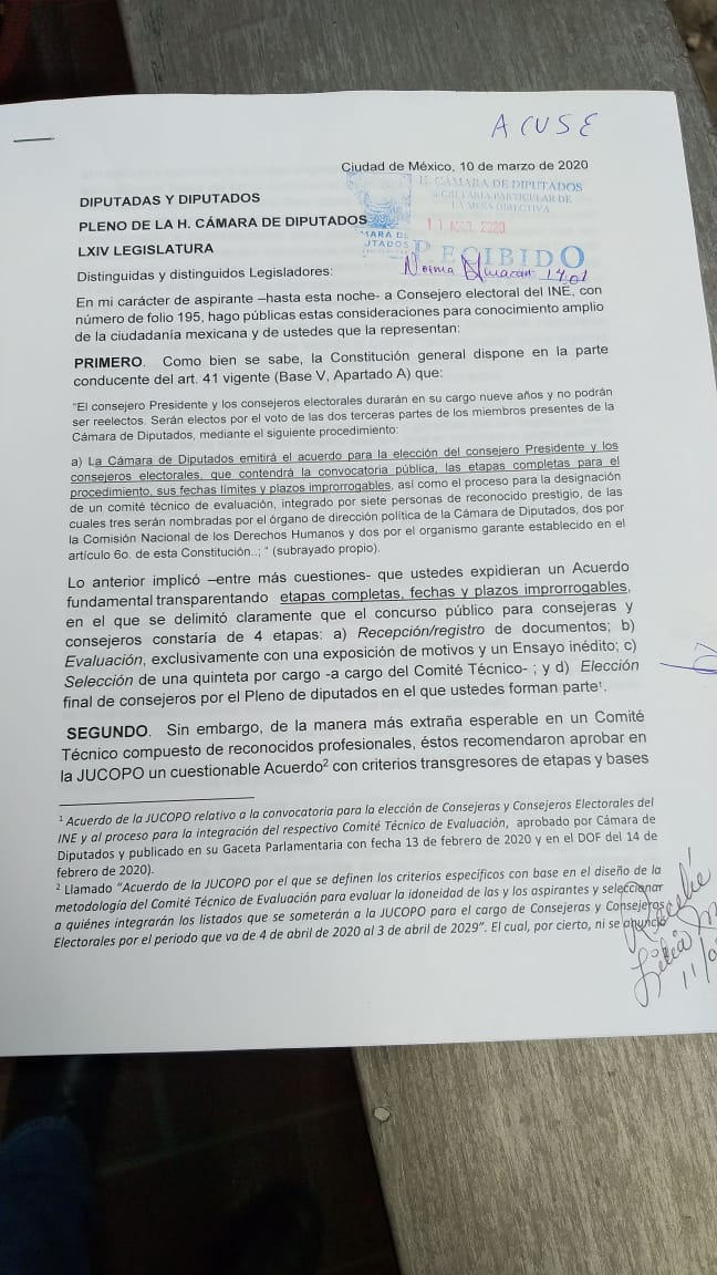 El académico señaló en su carta que “de la manera más extraña”, el Comité Técnico compuesto por reconocidos profesionales recomendó aprobar en la Junta de Coordinación Política de San Lázaro “un cuestionable acuerdo con criterios transgresores de etapas y bases, al modificar y suplantar la voluntad originaria del pleno” de la Cámara.