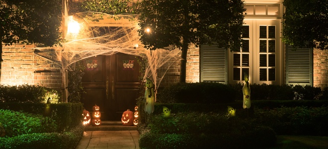 Coge una bolsa de algodón y ponte manos a la obra. Estírelo, ensarte y extiéndalo hasta que la entrada se convierta en un lío amenazador de telarañas. Agregue arañas compradas en la tienda o haga las suyas propias con hilo o papel grueso. Reemplace las bombillas de su porche con bombillas negras o naranjas para un efecto sombrío. Por supuesto, uno o dos esqueletos y un poco de humo pueden hacer que el factor espeluznante suba en la escala.