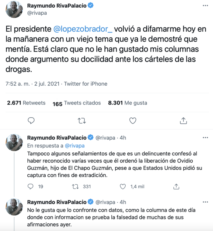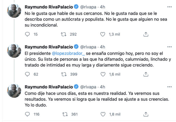 El periodista Raymundo Riva Palacio le contestó en Twitter con un hilo: