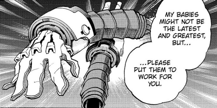 Deku y Tenya Ida visitaron recientemente al maestro fabricante de dispositivos de UA High, Mei Hatsume, para reparar sus disfraces de héroe. Ambos, que no eran enemigos, dañaron las suites del otro cuando Tenya y sus compañeros de clase no tuvieron más remedio que usar la fuerza contra Deku cuando decidió enfrentarse a All For One solo. Arreglarlos era una alta prioridad ya que los dos héroes en entrenamiento acaban de recibir una nueva misión que actualmente no se ha revelado al lector, que de alguna manera implica aprovechar al traidor Yuga Aoyama para su ventaja. Pero en el capítulo 339, Mei originalmente se niega rotundamente a arreglarlos, pero finalmente proporciona algunas imitaciones baratas que hizo con su mano no dominante mientras hablaba con ellos.