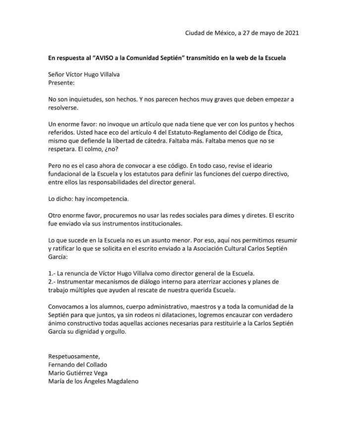 “Víctor Hugo Villalva, como se sabe, ocupó la dirección general de la Escuela con la lamentable pérdida del maestro José Luis Vázquez Baeza. Su designación, sin revisión y concurso alguno, supuso un mensaje que en nada tranquilizó a la comunidad Septién. Hoy, con una nueva pérdida para la Escuela, como es el reciente fallecimiento del profesor emérito Manuel Pérez Miranda, lo han colocado en una posición de mayor concentración de poder gracias a la vulnerabilidad y el vacío institucional que Villalva ha sabido aprovechar”, indicaron los firmantes.