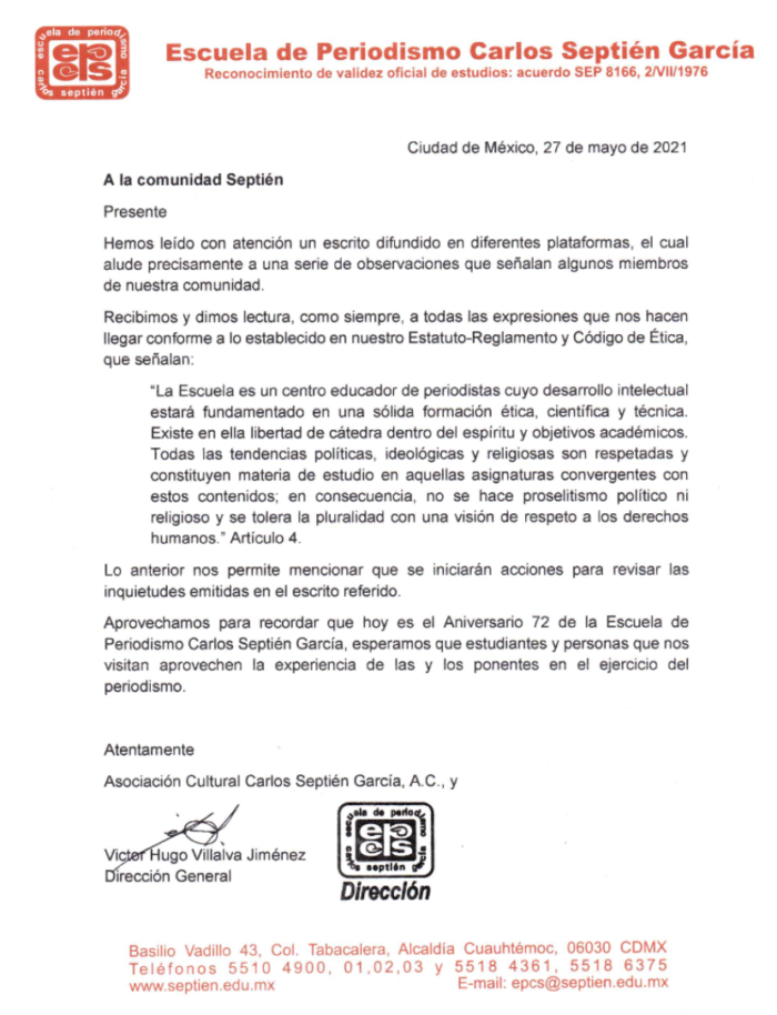 En pleno aniversario de la Escuela de Periodismo Carlos Septién García se dio a conocer una carta apuntalada por los docentes Fernando del Collado, María de los Ángeles Magdaleno y Mario Gutiérrez Vega, en la que urgen la renuncia de Víctor Hugo Villalva, director de esa institución.
