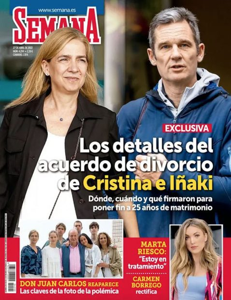 La revista Semana lleva a su portada a la Infanta Cristina e Iñaki Urdangarin. La publicación ofrece en exclusiva los detalles del acuerdo de divorcio de la pareja, casi cuatro meses después de que vieran la luz las primeras imágenes del exduque de Palma paseando de la mano de Ainhoa Armentia en una playa cercana a Bidart.