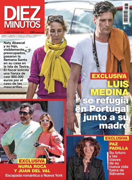 Por último, Diez Minutos ocupa su cubierta con tres exclusivas. La revista ofrece las imágenes de Luis Medina en compañía de su madre, Naty Abascal, con la que ha pasado unos días en Tavira después de que haya salido a la luz el escándalo por las comisiones de las mascarillas que él y Alberto Luceño suministraron al Ayuntamiento de Madrid. La revista también publica un amplio reportaje de la escapada de Juan del Val y Nuria Roca a Nueva York y desvela las claves del futuro de Paz Padilla tras su salida de Sálvame.