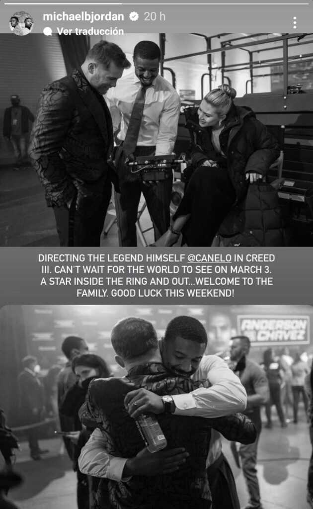 En una historia de Instagram, el actor protagonista y director de Creed III, Michael B. Jordan, publicó una foto junto a Saúl ‘Canelo’ Álvarez, donde se les ve haciendo una revisión de las tomas donde actuará el campeón mexicano.