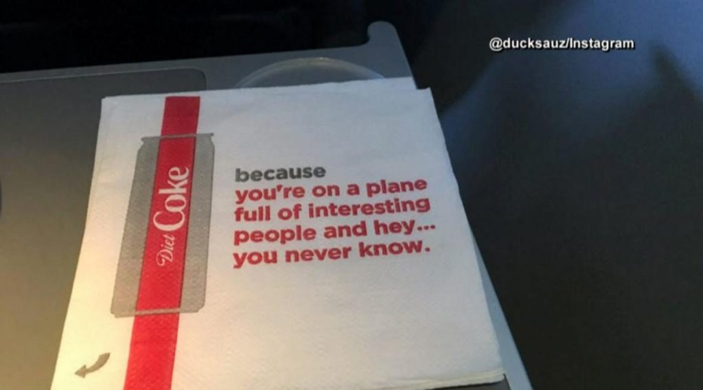 Las servilletas fueron calificadas como “ofensivas”. Las mismas tenían por un lado un mensaje que decía: “porque estás en una avión repleto de personas interesantes…nunca sabes”. Y por el otro lado había un espacio en blanco para colocar el nombre del pasajero y su teléfono con el fin de luego pasar ese papel a otra persona en el avión con quien hubiera atracción romántica.