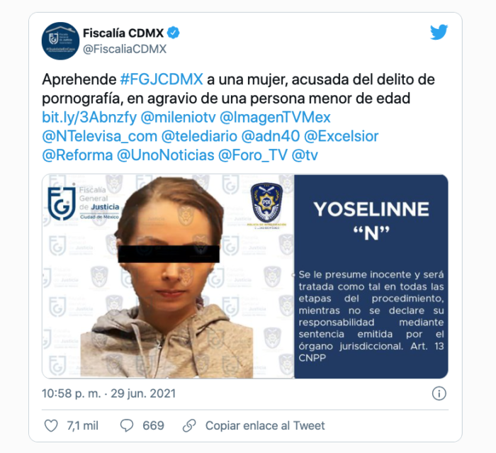 Yoseline H fue detenida la noche del martes 29 de junio por agentes de la Fiscalía de la Ciudad de México acusada del delito de pornografía infantil. La youtuber conocida como YosStop difundió en su canal de YouTube un video donde revictimiza a Ainara por el presunto abuso sexual que la joven padeció durante una fiesta.