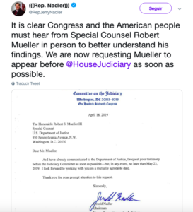 Por su parte, el presidente del Comité Judicial de la Cámara de Representantes, Jerry Nadler, realizó una petición similar, aunque puso como fecha máxima el 23 de mayo.