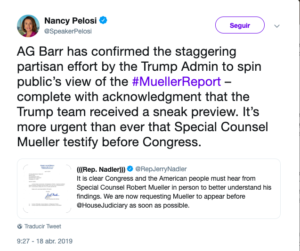 “Creemos que la única manera de comenzar a restaurar la confianza pública en el manejo de la investigación del fiscal especial es que el propio Mueller testifique públicamente en la Cámara de Representantes y el Senado lo antes posible. El pueblo estadounidense merece escuchar la verdad“, se lee en el comunicado conjunto.