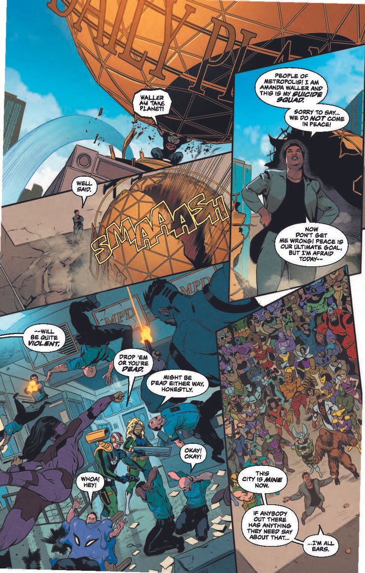Sin esperanza: Amanda aún no cuenta lo que ha planeado, así que yo tampoco… Pero sí, en este primer número vemos a Waller y su enorme Escuadrón Suicida Multiversal invadir la Metrópolis de Earth 3. Ella está desafiando a Ultraman y su Crime Syndicate a que vengan a hacer algo al respecto. Se produce el caos.