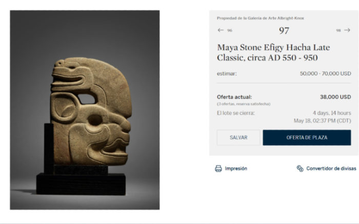 La pieza estelar es un hacha maya, de 28.6 centímetros de altura y con un precio de salida de 38 mil dólares; incluso, en la página web puede verse que cuenta ya con tres ofertas.