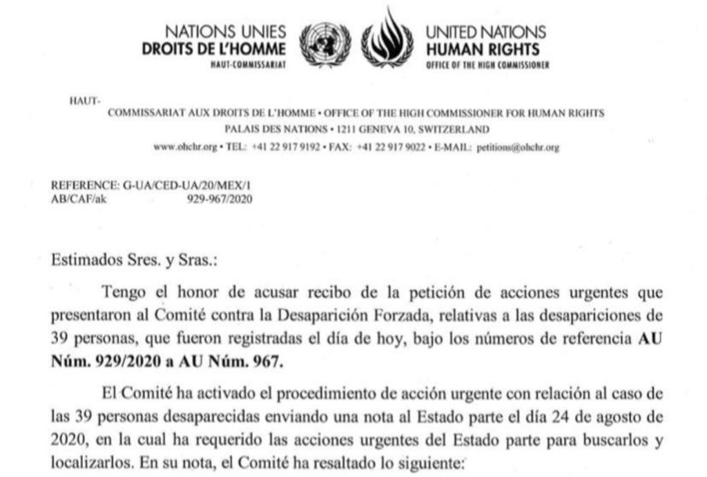 En un documento, firmado por el jefe de la subdivisión de tratados de Derechos Humanos, Ibrahim Salama confirma de recibido el expediente AU 929/2020 a AU Núm.967, y solicita al Estado mexicano enviar información sobre las acciones emprendidas a partir de este reporte, a más tardar el 7 de septiembre de 2020.