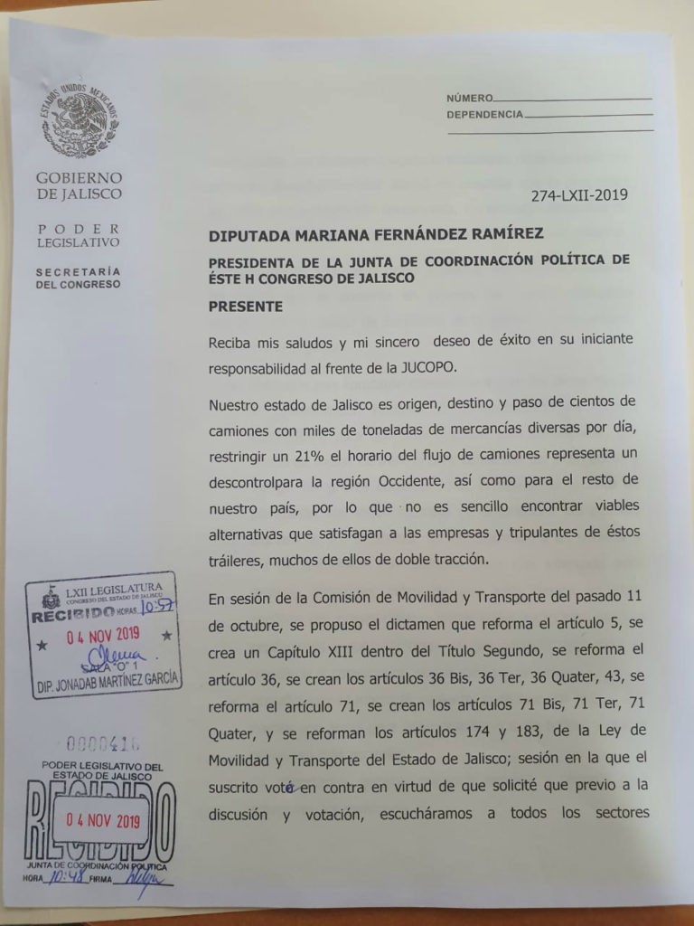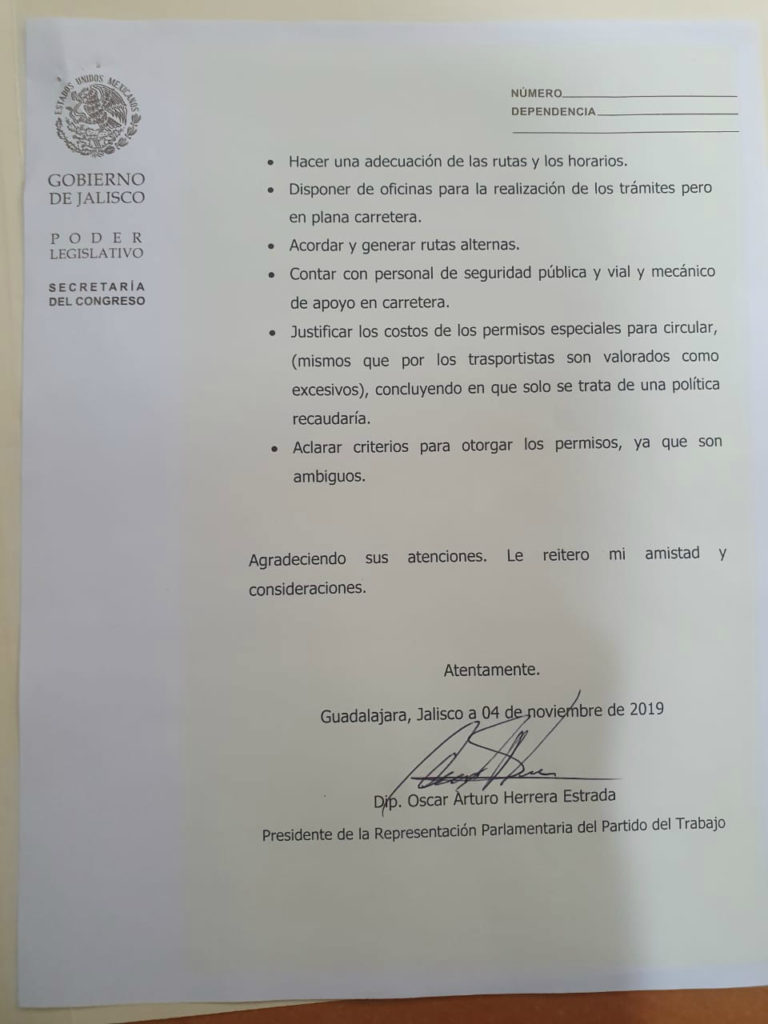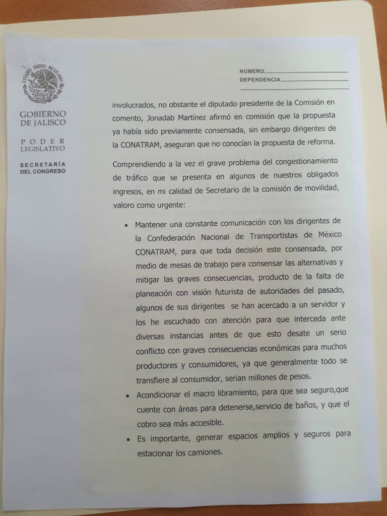 Durante la Junta de Coordinación Política del Congreso de Jalisco, (PT), leyó un pliego petitorio en el que la Confederación Nacional de Transportistas de México (Conatram) denuncia, entre otras cosas, violencia, inseguridad, altos costos y falta de servicios públicos en el macrolibramiento recién inaugurado en la entidad.