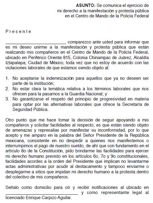 A través de un formato distribuido por el abogado Carpizo, que permite a los agentes rellenar con su nombre, domicilio, fecha y firma, se pide a los mandos de la Policía Federal que se respete la palabra del presidente López Obrador, consistente en no despedir, interrumpir el pago del sueldo o levantar actas administrativas a los oficiales manifestantes.