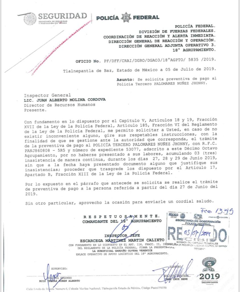 Carpizo Aguilar también proporcionó un documento firmado por el inspector jefe, Martín Calixto Escárcega Martínez, en el que se solicitaba al titular de Recursos Humanos de la Policía Federal que se tramite la preventiva de pago al policía tercero, Jhonny Palomares Núñez, por no haberse presentado a sus labores de manera contínua los días 27, 28 y 29 de junio, sin presentar un documento que justifique sus inasistencias, apegándose al contenido del artículo 17, apartado B, fracción XIII de la Ley de la Policía Federal.