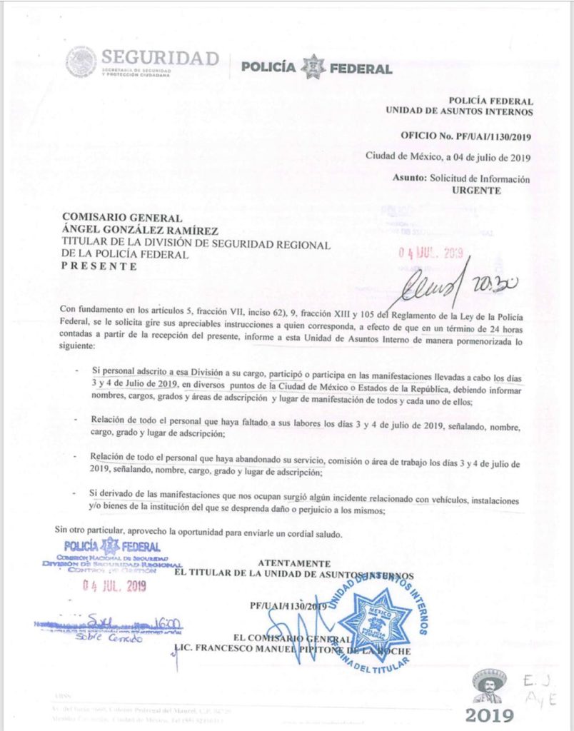 También presentó documentos que evidencian cómo el comisario general de la Policía Federal, Ángel González Ramírez, giró instrucciones al titular de la Unidad de Asuntos Internos, Francesco Pipitone, para que le presente un informe que contenga la siguiente información: