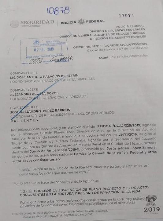 El presidente del Inprodh, y representante legal de un grupo de policías federales manifestantes, explicó que un agente federal de nombre Jesús Adrián López Zamora ha interpuesto el juicio de amparo 568/2019-II en contra del comisario General de la Policía Federal y de otras autoridades, que han girado “la orden verbal de la privación ilegal de libertad, muerte y tortura y ejecución”.
