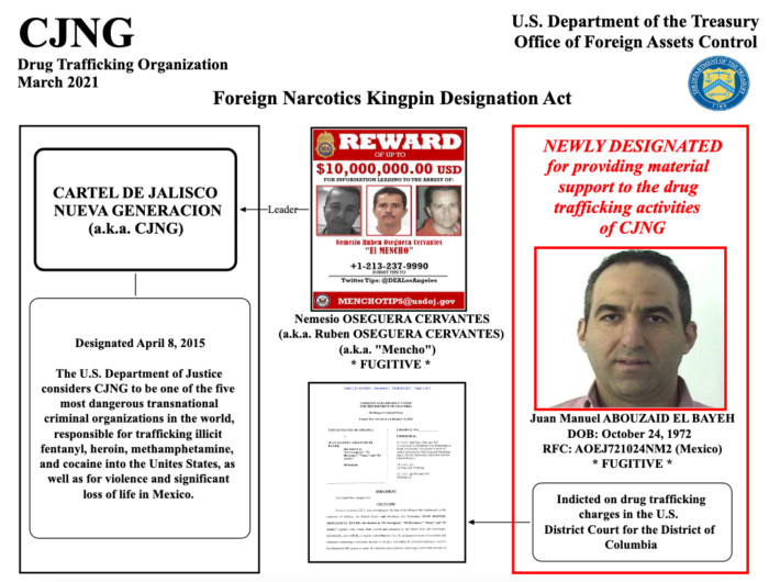 La OFAC designó a Abouzaid El Bayeh por su papel de “alto nivel” en la facilitación de envíos de drogas y lavado de dinero para el Cártel de Jalisco Nueva Generación (CJNG), al cual califican como “una violenta organización mexicana de narcotráfico que es responsable del tráfico de una proporción significativa del fentanilo y otras drogas mortales”.