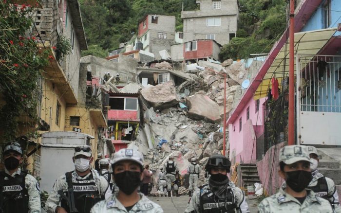 Elementos de la Guardia Nacional (GN) desalojaron al 50 por ciento de las familias que se encuentran en riesgo ante la posibilidad de nuevos deslaves en el cerro del Chiquihuite, ubicado en la colonia Lázaro Cárdenas, municipio de Tlalnepantla, Estado de México.