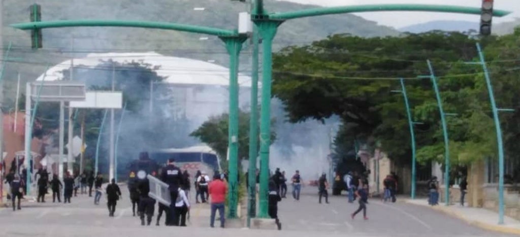 Los estudiantes se refugiaron en las calles aledañas a su centro educativo. A ese lugar también los siguieron los policias de la la Secretaría de Seguridad y Protección Ciudadana (SSyPC), lanzando gases lacrimógenos y balas de goma que alcanzaron el interior de la escuela normal.