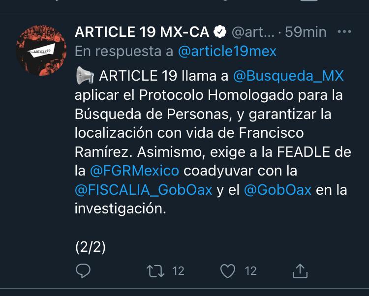 Al respecto, la organización periodística Artículo 19 emitió una alerta e hizo el llamado a la Comisión Nacional de Búsqueda para que aplique el protocolo homologado para la búsqueda de personas y garantizar la localización con vida de Francisco Ramírez.