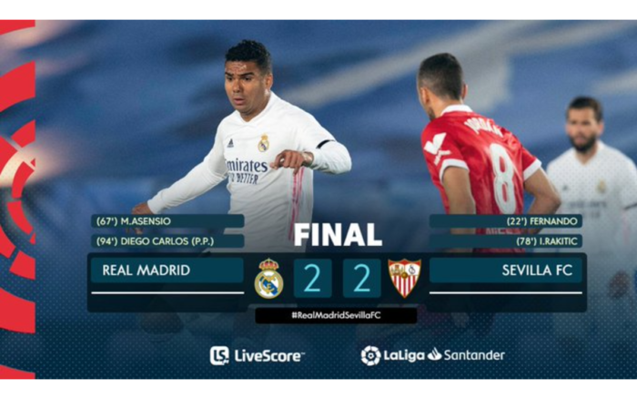 ⚽ @marcoasensio10 67′, Diego Carlos (p.p.) 90+4′ ; Fernando 22′, Rakitić (p) 78′#Emirates | #RealMadridSevillaFC pic.twitter.com/8uxpUOV2U3— Real Madrid C.F. (@realmadrid) May 9, 2021