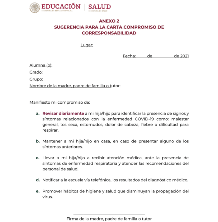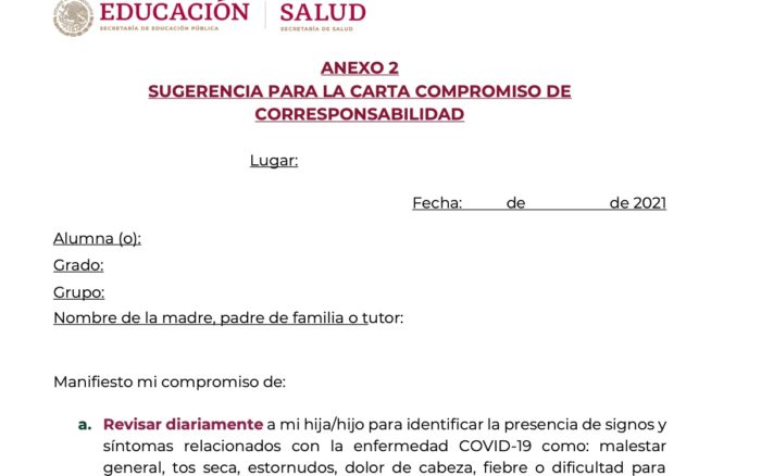 La carta incluye el nombre, grado, grupo del alumno así como el nombre de la madre, padre o tutor. Quien firma manifiesta su compromiso de “revisar diariamente a mi hija/hijo para identificar la presencia de signos y síntomas relacionados con la enfermedad COVID-19 como: malestar general, tos seca, estornudos, dolor de cabeza, fiebre o dificultad para respirar”.