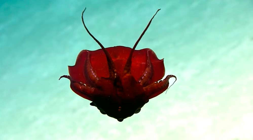 Esta fue la primera pregunta que se hicieron los científicos al ver por primera vez al Discoteuthis discus. Se trata de una especie de calamar que nunca se había observado con vida y que ha sido encontrada a una profundidad de 800 metros en el Golfo de México. Desde los primeros compases del descubrimiento, los investigadores dudaron si este espécimen se trataba de un extraño insecto. Sus peculiares formas y su color rojo intenso, daban a entender que se trataba de un organismo desconocido para la mayoría. Sin embargo, después de un laborioso análisis, el animal fue marcado como el calamar que faltaba por identificar.