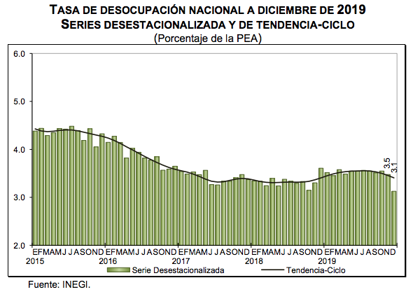 De acuerdo con el organismo, la tasa de desempleo es inferior en 0.4 puntos porcentuales con respecto a noviembre, cuando este indicador alcanzó 3.5 por ciento de la PEA, y menor en 0.5 puntos porcentuales a la de diciembre de 2018, de acuerdo con datos ajustados por estacionalidad.