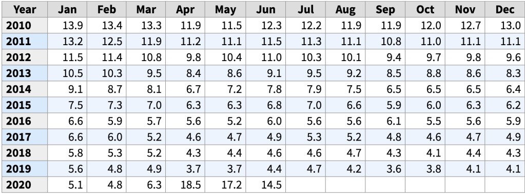 Como reflejo de la reapertura gradual de la economía, golpeada por la pandemia de COVID-19, entre los principales grupos de trabajadores, las tasas de desempleo disminuyeron en junio para los hombres adultos (10.2%), mujeres adultas (11.2%), adolescentes (23,2%), persona de raza blanca (10,1%), personas de raza negra (15.4%) e hispanos (mayores de 16 años), grupo cuya cifra bajó a 14.5% desde 17.2% en mayo.