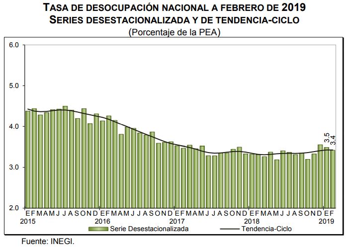 En febrero pasado, el desempleo en el país se ubicó en 3.4 por ciento, cifra menor a la registrada en enero, cuando se ubicó en 3.5 por ciento, de acuerdo con cifras desestacionalizadas del Instituto Nacional de Estadística y Geografía (Inegi).