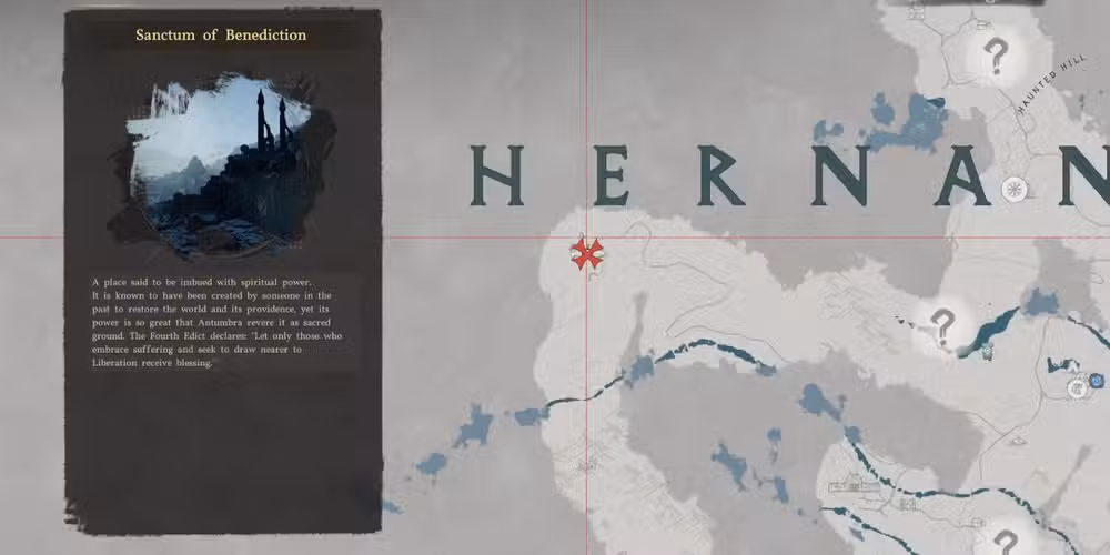 El Santuario de la Bendición en Desierto carmesí se puede encontrar en el oeste de Hernand, justo al sur de la “E” en Hernand (ver arriba). Es uno de los cuatro santuarios necesarios para completar. “La bruja de la sabiduría” línea de misiones, y después limpiando el área de enemigosnecesitarás armar el aparato en el lugar para “limpiar” el Santuario y poder hablar con la Bruja.