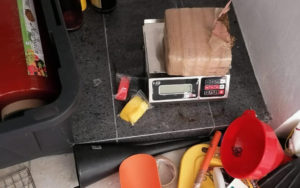 En una cocina, se localizaron diversas bolsas plásticas transparentes, las cuales contenían papel mojado, por lo que un perito especializado aplicó reactivos con lo que se comprobó la presencia de cocaína; en otra habitación, se localizó un paquete de vegetal verde, característico de marihuana, envuelto con cinta canela. De igual forma, se hallaron dos básculas electrónicas, envases de vidrio para almacenar químicos y 13 paquetes con polvo blanco.