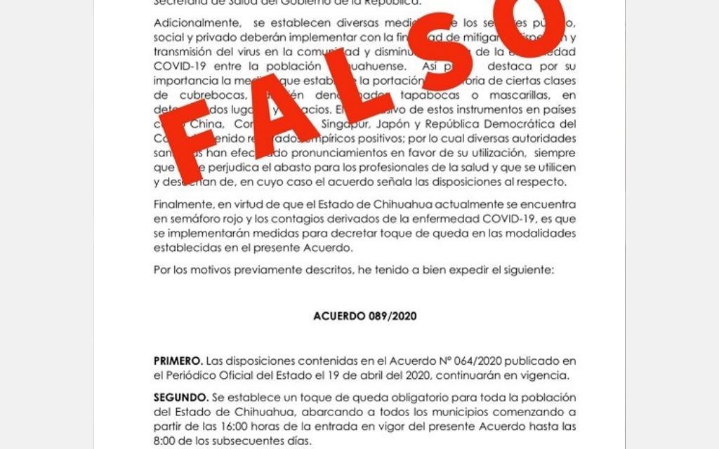 El secretario de Gobierno de Chihuahua, Luis Fernando Mesta Soulé, señaló que es totalmente falso el documento que circula en redes sociales y chats de Whatsapp, por el que supuestamente se declara “toque de queda” en toda la entidad, luego del aumento de casos de Covid-19.