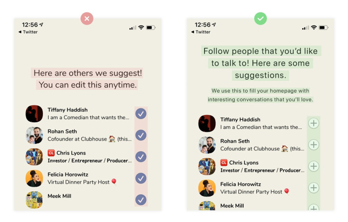 Clubhouse ha adoptado claramente una metodología similar, al preseleccionar a 50 personas para que las sigas mientras te registras.