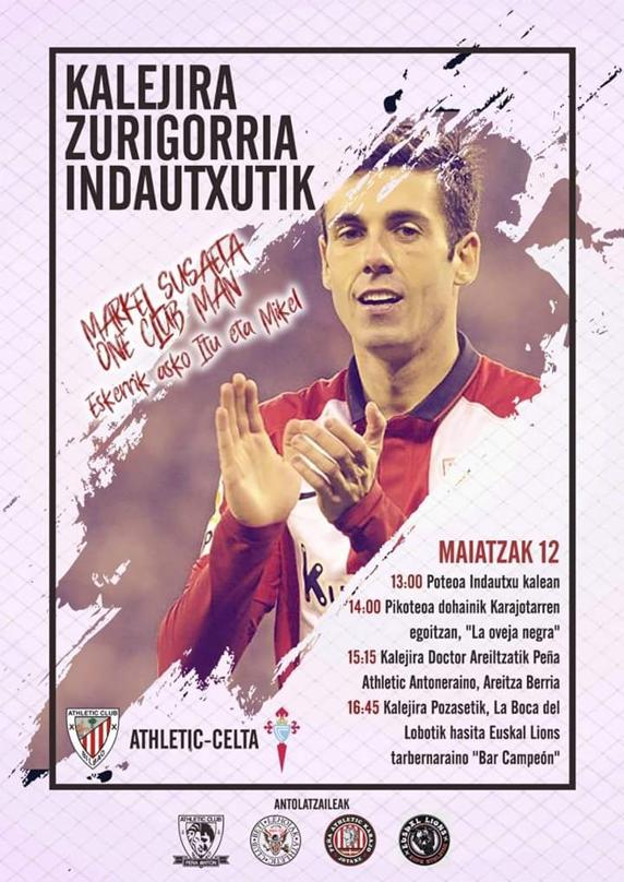 Rico en los prolegómenos del partido contra el Celta. A la una de la tarde se celebrará un poteo en Indautxu, justo después, un picoteo en la sede de la Peña Karajo ‘La Oveja Negra’. A las 15.15 h. pasará la kalejira por la sede de la Peña Anton en la calle Doctor Areilza, para seguir después por la calle Pozas desde ‘La Boca del Lobo’ hasta el ‘Bar Campeón’ de la Peña Euskal Lions.