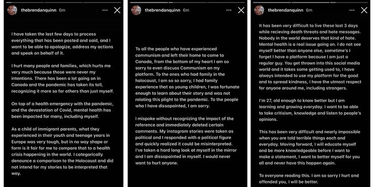 A medida que avanzaba su disculpa, Brendan se disculpó por comparar los mandatos de vacunas con el comunismo y se dirigió directamente a aquellos que se vieron afectados por los regímenes comunistas y, como resultado, emigraron a Canadá (de donde él es). Brendan escribió, “Desde el fondo de mi corazón, lamento mucho incluso hablar del comunismo en mi plataforma”. Luego habló sobre eliminar los comentarios que hizo en su propio perfil de Instagram para aplaudir a los seguidores que intentaban corregirlo. En su tercera y última historia de Instagram, Brendan comentó: “Ha sido muy difícil vivir estos últimos 3 días mientras [receiving] amenazas de muerte y mensajes de odio. Nadie en el mundo merece ese tipo de odio”. Explicó que a menudo se le olvida que tiene una “plataforma” porque el es solo un “chico normal” con 40.000 seguidores tras su paso por El bachillerato.