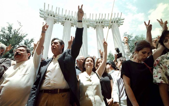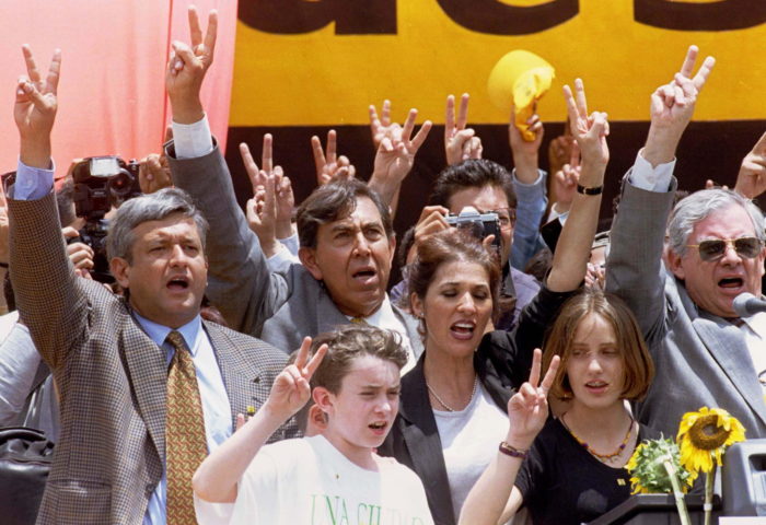 Esta imagen de la agencia Reuters retrata el mitin que realizó Cuauhtémoc Cárdenas en junio de 1997 durante la campaña para la jefatura de Gobierno del entonces DF: Cárdenas, Celeste Batel y su hija hacen la “V” de la victoria junto a López Obrador, entonces líder del PRD.