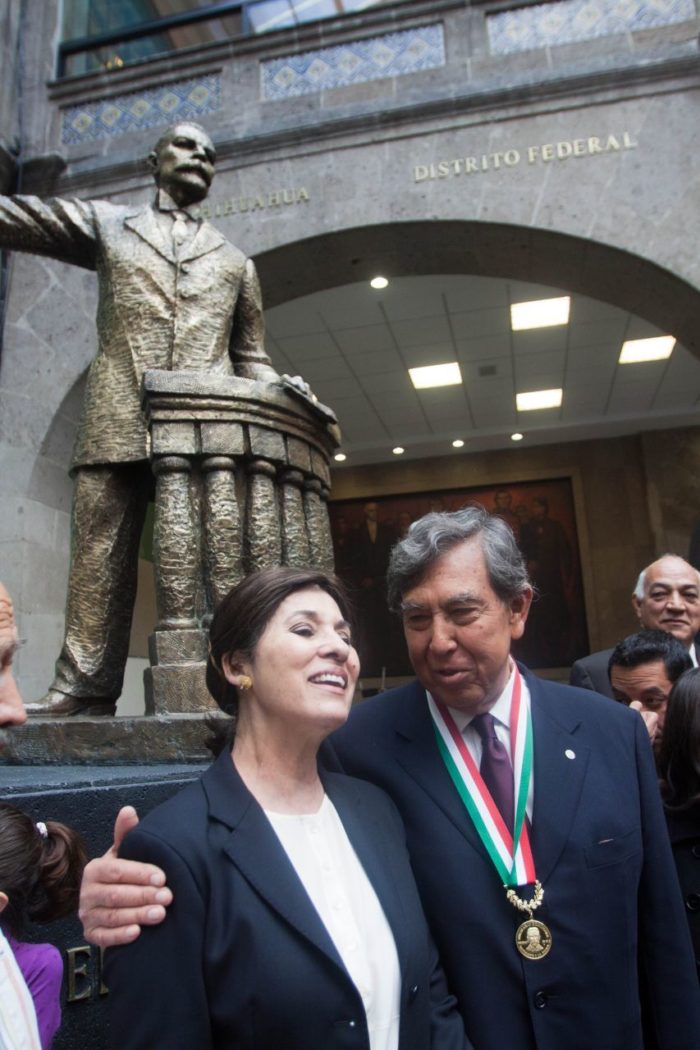 27 de octubre de 2011: El líder de la izquierda mexicana Cuauhtémoc Cárdenas Solorzano y su esposa Celeste Batel se tomaron la foto frente a la estatua del histórico senador Belisario Domínguez en la antigua casona de Xicoténcatl. El fundador del PRD recibió la medalla que lleva el nombre del senador chiapaneco quien defendió con su vida el golpe militar del dictador Victoriano Huerta.