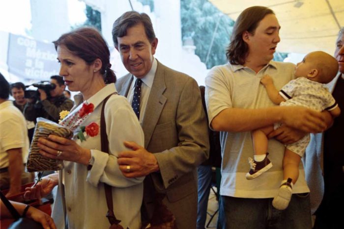 9 de mayo del 2000: Celeste Batel, Cuauhtémoc Cárdenas y Cuauhtémoc Cárdenas Batel con su hijo en brazos, el término de la celebración del día de las madres que encabezó el entonces candidato de la Alianza por México.
